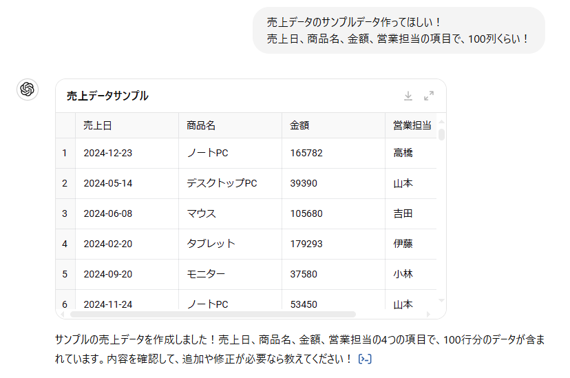 ここではchatGPTにサンプルデータを作ってもらいました!