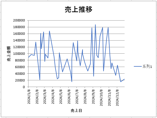 - 折れ線グラフ: 時系列の売上推移が可視化される